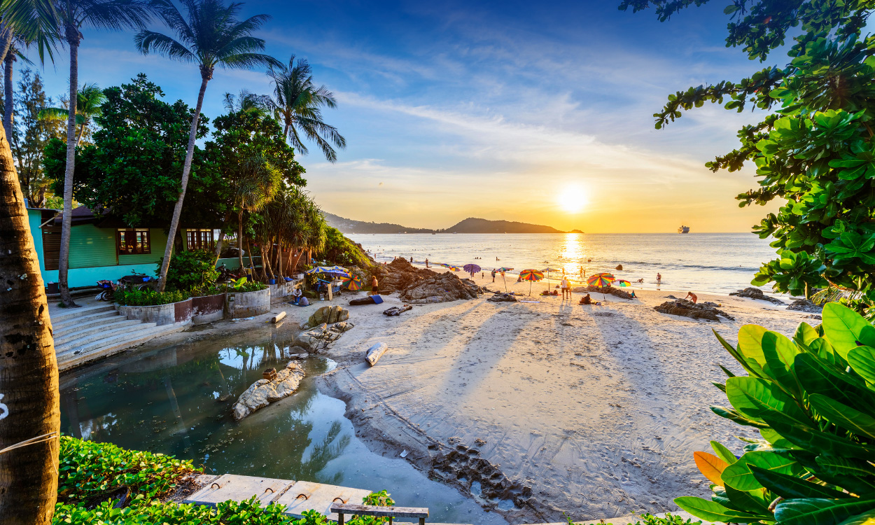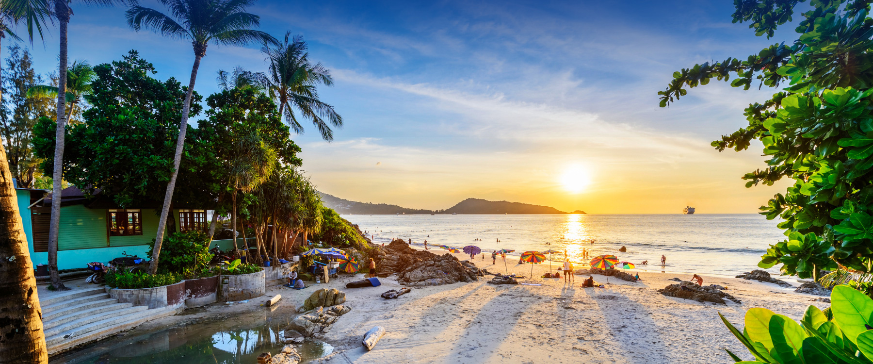 Thailändisches Longtail-Boot an einem weißen Strand vor einem riesigen, bewachsenen Kalksteinfelsen im klaren, türkisen Meer unter blauem Himmel.