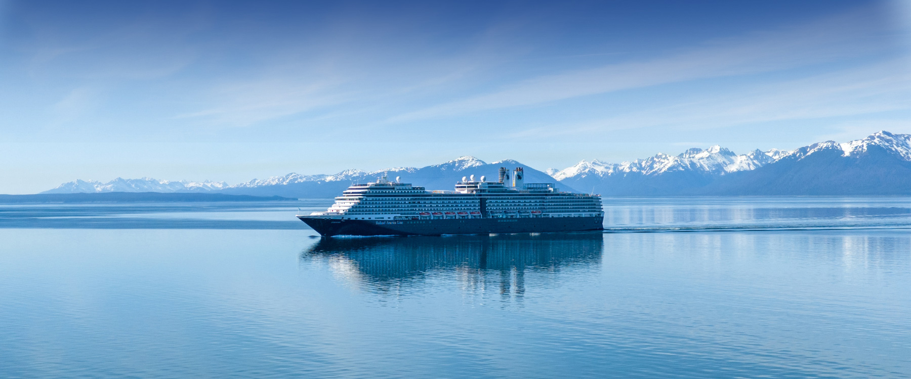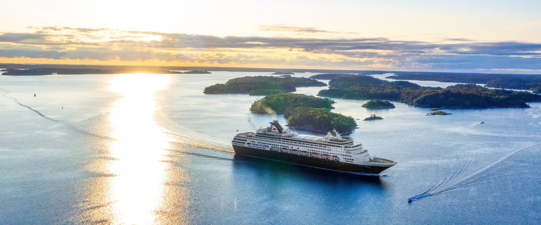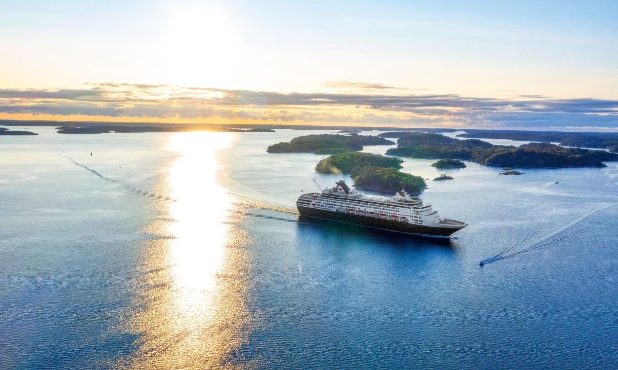 Blick über die Reling eines Kreuzfahrtschiffs auf das offene Meer. Die Kielspur des Schiffs zieht sich in die weite, blaue Ferne.