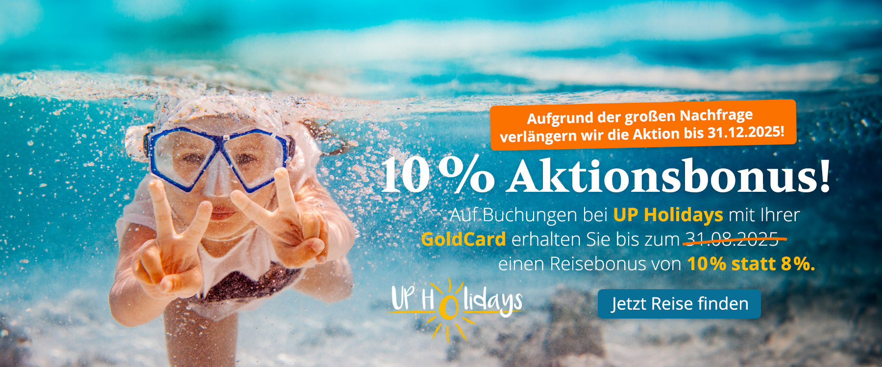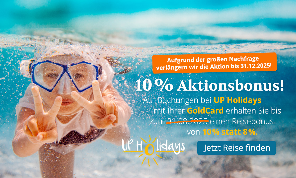 Eine Werbekachel des Veranstalters UP Holidays, die exklusive Vorteile verspricht. Ein Kind mit blauer Taucherbrille und Schnorchelmaske blickt unter Wasser direkt in die Kamera und formt mit beiden Händen ein 'Peace'-Zeichen. Die Wasseroberfläche mit Sonnenlichtreflexionen ist im oberen Bildbereich sichtbar, und das Wasser hat eine helle, türkise Farbe.
